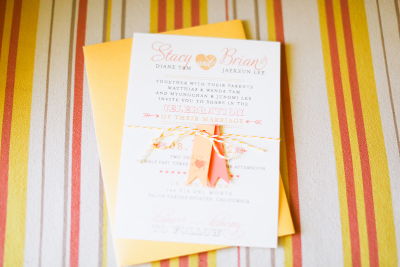 How exciting is it that Stacy & Brian were married over the same Palos Verdes cliffs where they sat some 10 years ago, talking and getting to know each other just as friends? And that despite having 10 years under their belt, they glance at each other with such sparkle and adoration, as if they’re seeing each other for the first time? And that we had the most perfect weather on their wedding day, a day that was filled with an overjoyed group of family and friends, and tons of thoughtful details (like tangerine escort cards, and a grilled cheese station!!)